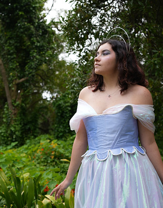 I designed a collection I would confidently wear myself over and over again. I focused on my favorite elements from my inspiration (a woman wading in water, reflective water droplets, the array of colors from crystals, the celestial sky, soft flower petals) and Sapphic Dream was created. Featured in this collection are a combination of my favorite pieces to sew and my favorite silhouettes including historical inspired corsets and stays, appliqued tulle, cowl necklines, and romantic swooping capes and trains.